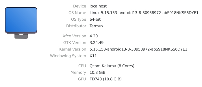 | ~ $ glxinfo -B name of display: :0 display: :0 screen: 0 direct rendering: Yes Extended renderer info (GLX_MESA_query_renderer): Vendor: Mesa (0x5143) Device: zink Vulkan 1.4(Turnip Adreno (TM) 740 (MESA_TURNIP)) (0x43050a01) Version: 25.1.1 Accelerated: yes Video memory: 8284MB Unified memory: yes Preferred profile: core (0x1) Max core profile version: 4.6 Max compat profile version: 4.6 Max GLES1 profile version: 1.1 Max GLES[23] profile version: 3.2 Memory info (GL_ATI_meminfo): VBO free memory - total: 8280 MB, largest block: 8280 MB VBO free aux. memory - total: 0 MB, largest block: 0 MB Texture free memory - total: 8280 MB, largest block: 8280 MB Texture free aux. memory - total: 0 MB, largest block: 0 MB Renderbuffer free memory - total: 8280 MB, largest block: 8280 MB Renderbuffer free aux. memory - total: 0 MB, largest block: 0 MB Memory info (GL_NVX_gpu_memory_info): Dedicated video memory: 8284 MB Total available memory: 8284 MB Currently available dedicated video memory: 8280 MB OpenGL vendor string: Mesa OpenGL renderer string: zink Vulkan 1.4(Turnip Adreno (TM) 740 (MESA_TURNIP)) OpenGL core profile version string: 4.6 (Core Profile) Mesa 25.1.1 OpenGL core profile shading language version string: 4.60 OpenGL core profile context flags: (none) OpenGL core profile profile mask: core profile OpenGL version string: 4.6 (Compatibility Profile) Mesa 25.1.1 OpenGL shading language version string: 4.60 OpenGL context flags: (none) OpenGL profile mask: compatibility profile OpenGL ES profile version string: OpenGL ES 3.2 Mesa 25.1.1 OpenGL ES profile shading language version string: OpenGL ES GLSL ES 3.20 |