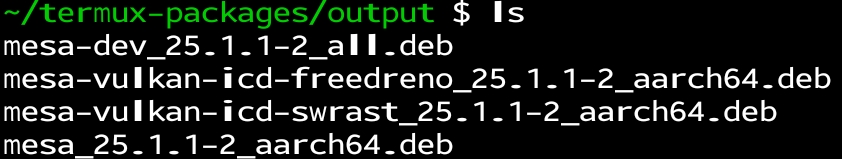 | ~/termux-packages/output $ mkdir temp ~/termux-packages/output $ dpkg -x mesa_25.1.1-2_aarch64.deb temp/ ~/termux-packages/output $ dpkg -e mesa_25.1.1-2_aarch64.deb temp/DEBIAN ~/termux-packages/output $ rm -rf temp/data/data/com.termux/files/usr/lib/python3.12/ |