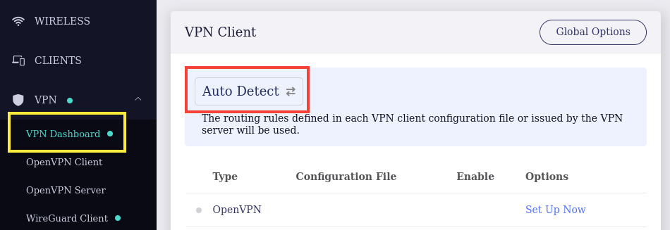 Wireguard 설정파일에 allowed-ips 만 wireguard를 통하도록 설정하기 위해서 Auto Detect로 설정합니다.