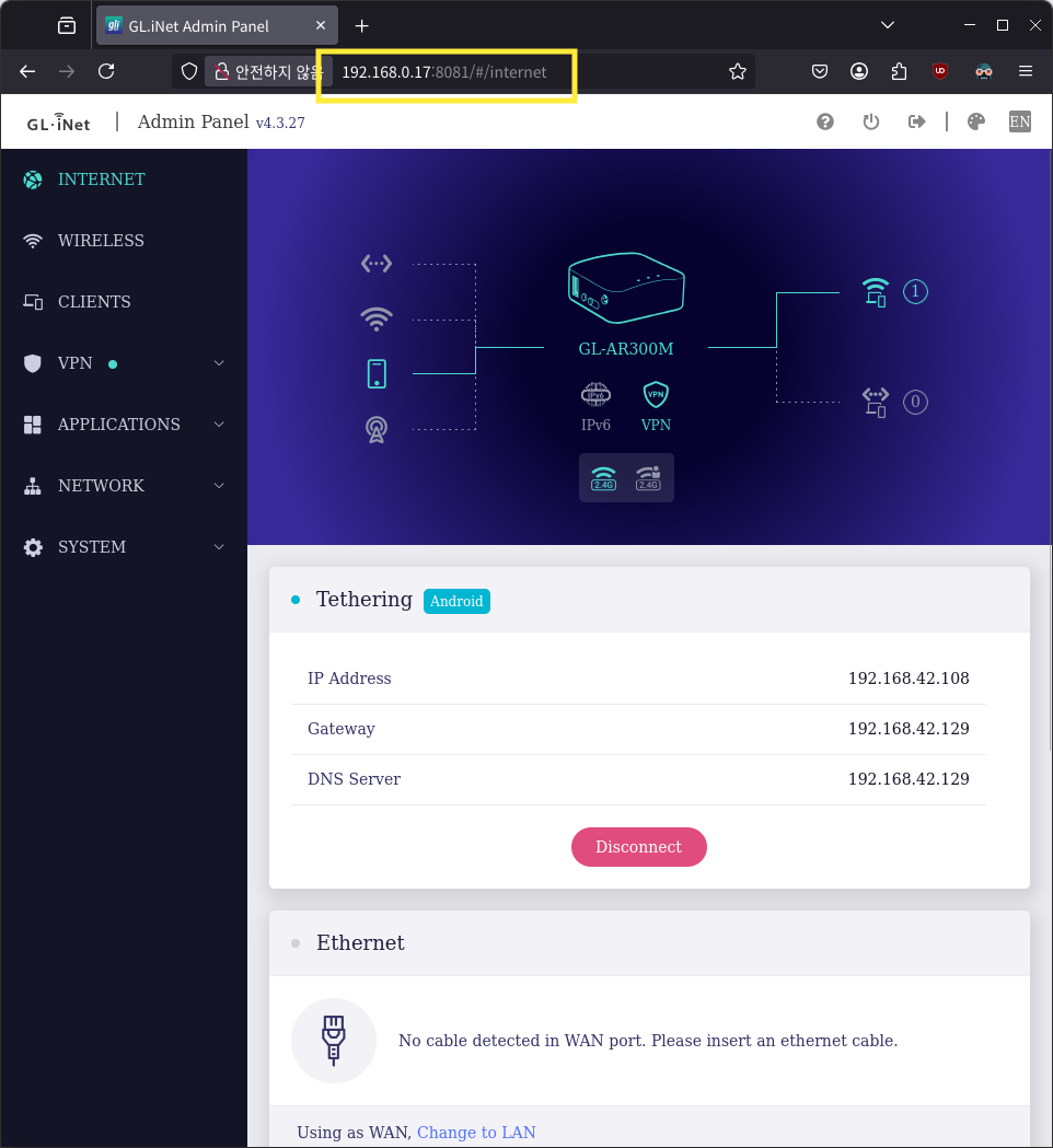 현재 아래와 같이 USB테더링을 통해 망고에 연결되어 있습니다.