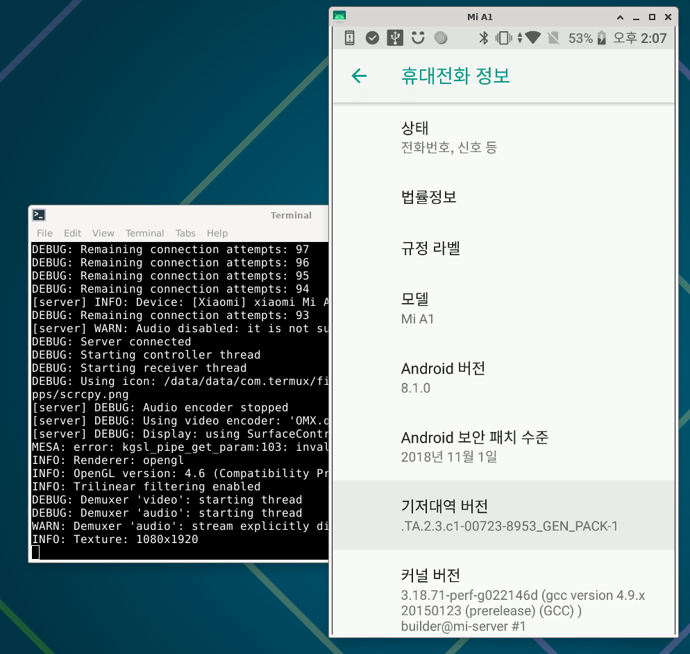 | ~ $ scrcpy -b 2M scrcpy 3.3.1 <https://github.com/Genymobile/scrcpy> INFO: ADB device found: INFO: --> (tcpip) 192.168.0.17:5555 device Mi_A1 DEBUG: Device serial: 192.168.0.17:5555 DEBUG: Using server: /data/data/com.termux/files/usr/share/scrcpy/scrcpy-server /data/data/com.termux/files/usr/share/scrcpy/scrcpy-server: 1 file pushed, 0 skipped. 70.7 MB/s (90788 bytes in 0.001s) adb: error: more than one device/emulator ERROR: "adb reverse" returned with value 1 WARN: 'adb reverse' failed, fallback to 'adb forward' DEBUG: Remaining connection attempts: 100 DEBUG: Remaining connection attempts: 99 DEBUG: Remaining connection attempts: 98 DEBUG: Remaining connection attempts: 97 DEBUG: Remaining connection attempts: 96 DEBUG: Remaining connection attempts: 95 DEBUG: Remaining connection attempts: 94 [server] INFO: Device: [Xiaomi] xiaomi Mi A1 (Android 8.1.0) DEBUG: Remaining connection attempts: 93 [server] WARN: Audio disabled: it is not supported before Android 11 DEBUG: Server connected DEBUG: Starting controller thread DEBUG: Starting receiver thread DEBUG: Using icon: /data/data/com.termux/files/usr/share/icons/hicolor/256x256/apps/scrcpy.png [server] DEBUG: Audio encoder stopped [server] DEBUG: Using video encoder: 'OMX.qcohttp://m.video.encoder.avc' [server] DEBUG: Display: using SurfaceControl API MESA: error: kgsl_pipe_get_param:103: invalid param id: 13 INFO: Renderer: opengl INFO: OpenGL version: 4.6 (Compatibility Profile) Mesa 25.1.1 INFO: Trilinear filtering enabled DEBUG: Demuxer 'video': starting thread DEBUG: Demuxer 'audio': starting thread WARN: Demuxer 'audio': stream explicitly disabled by the device INFO: Texture: 1080x1920 |