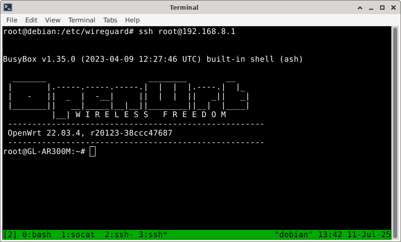 | root@debian:/etc/wireguard# ssh root@192.168.8.1 BusyBox v1.35.0 (2023-04-09 12:27:46 UTC) built-in shell (ash) _______ ________ __ | |.-----.-----.-----.| | | |.----.| |_ | - || _ | -__| || | | || _|| _| |_______|| __|_____|__|__||________||__| |____| |__| W I R E L E S S F R E E D O M ----------------------------------------------------- OpenWrt 22.03.4, r20123-38ccc47687 ----------------------------------------------------- root@GL-AR300M:~# |