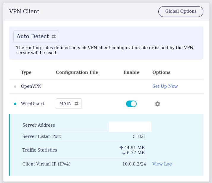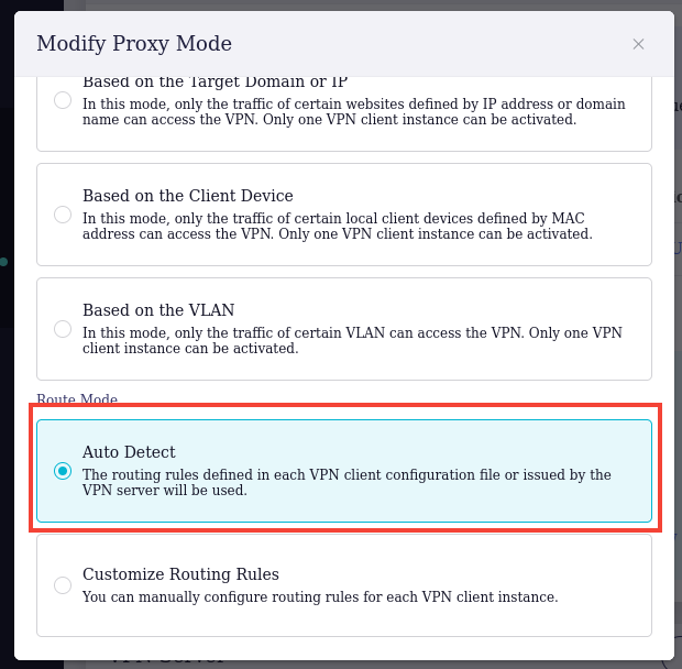 Wireguard 설정파일에 allowed-ips 만 wireguard를 통하도록 설정하기 위해서 Auto Detect로 설정합니다.